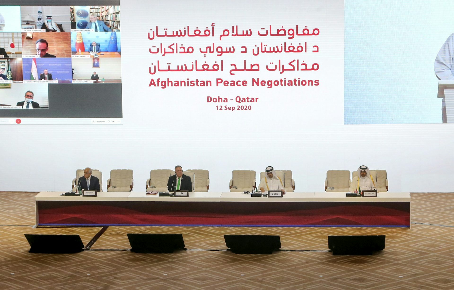 No purple strains: US secretary of state, Mike Pompeo, and US particular consultant for Afghanistan, Zalmay Khalilzad, with Qatari international minister, Sheikh Mohamad Al-Thani and particular envoy, Mutlaq al-Qahtan in Doha, September 2020.