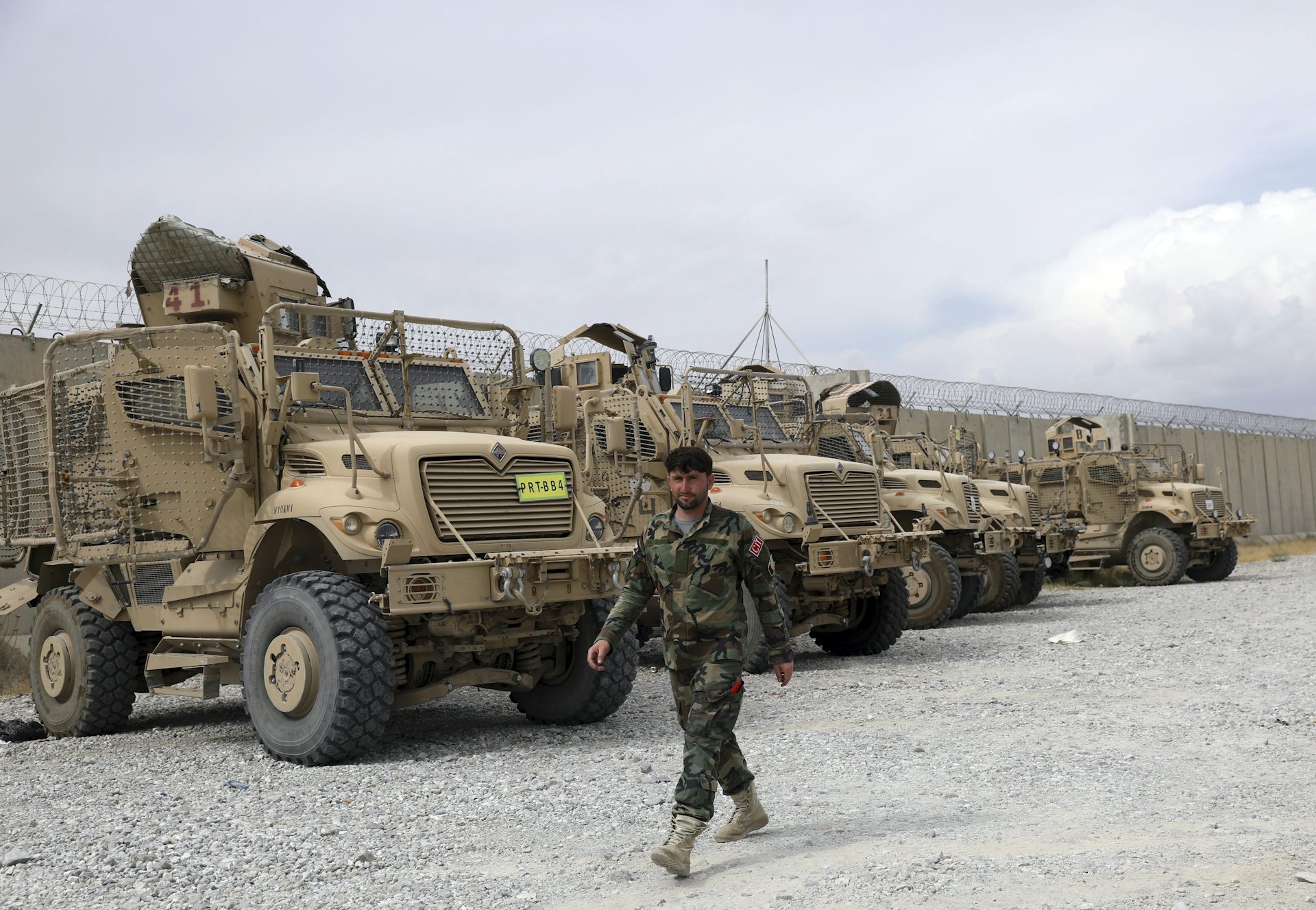 An Afghan military soldier walks previous US army automobiles left after the American withdrawal of Bagram air base.