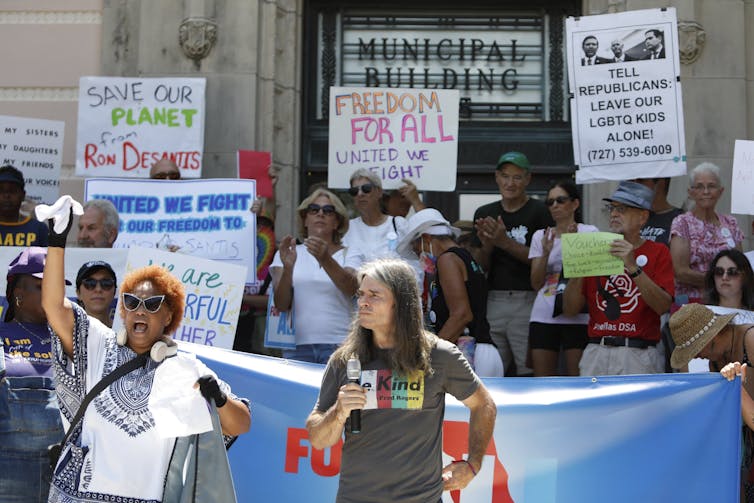 Highschool instructor Brandt Robinson, backside centre, speaks all the way through a rally hosted by means of Florida Emerging in St. Petersburg, Fla., in July 2023, the place other folks protested expenses on training and different problems.