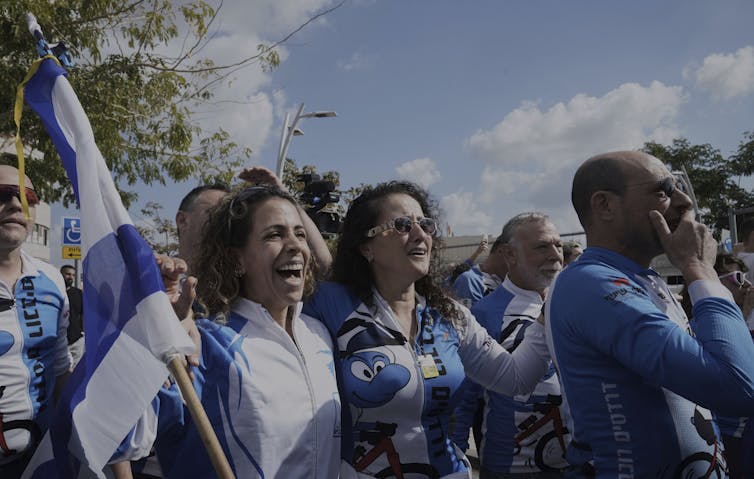 Biking pals of Israeli hostage Ofer Kalderon rejoice his unlock as a part of a ceasefire in Gaza at a sanatorium in Ramat Gan, Israel, on Feb. 1, 2025.