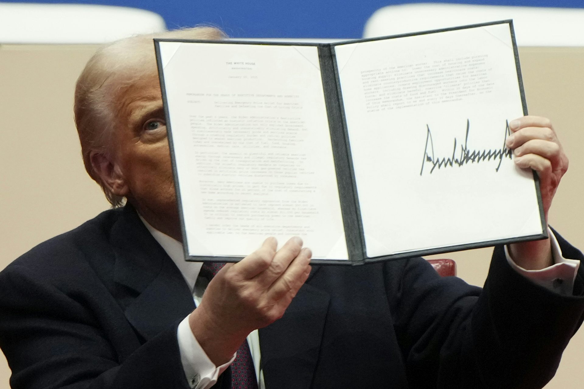 U.S. President Donald Trump holds up an govt order after signing it at a presidential inauguration match in Washington on Jan. 20, 2025. A federal courtroom pass judgement on not too long ago blocked Trump’s orders associated with EDI, announcing they might violate the U.S. charter.